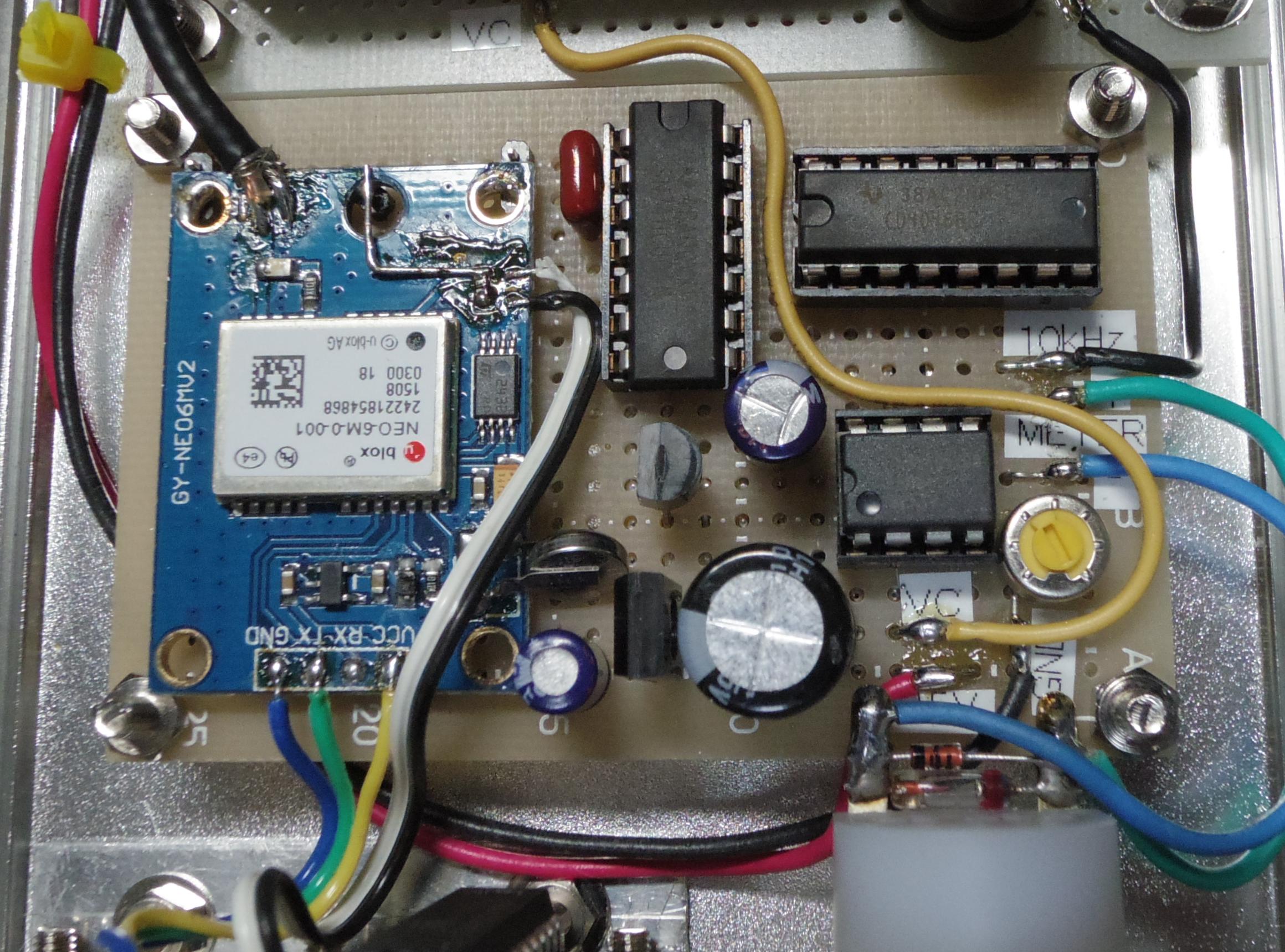 今回もそうしました。また,ケースは小さい物にしましたので,基板もギリギリの高密度実装です。大きめの基板にはOCXOと4046,そしてOP-AMPをのせました。もう1枚の小さい基板にはGPSモジュールと分周器をのせました。